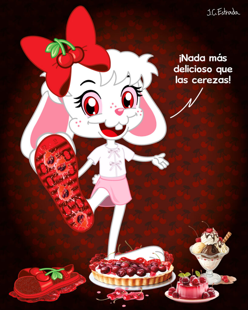 Se puede ver que a Gretiti le encantan las cerezas y todos los postres elaborados con ellas, aunque su manera de saborearlos es definitivamente muy poco convencional: por fortuna sus sandalias son de suela antiderrapante, para que pueda disfrutarlos sin riesgo de tener resbalones 🍒